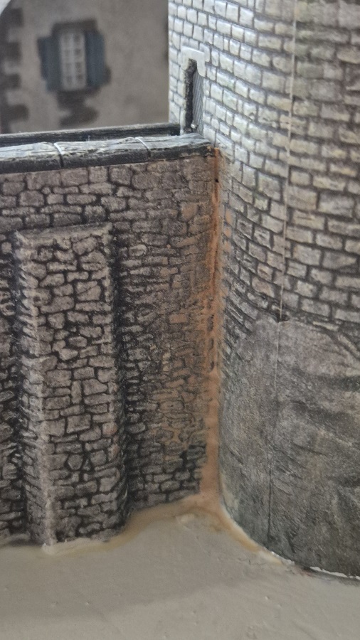 Due to colour differences from the original at the transitions, the entire cobblestone street had to be painted, followed by aging and weathering.